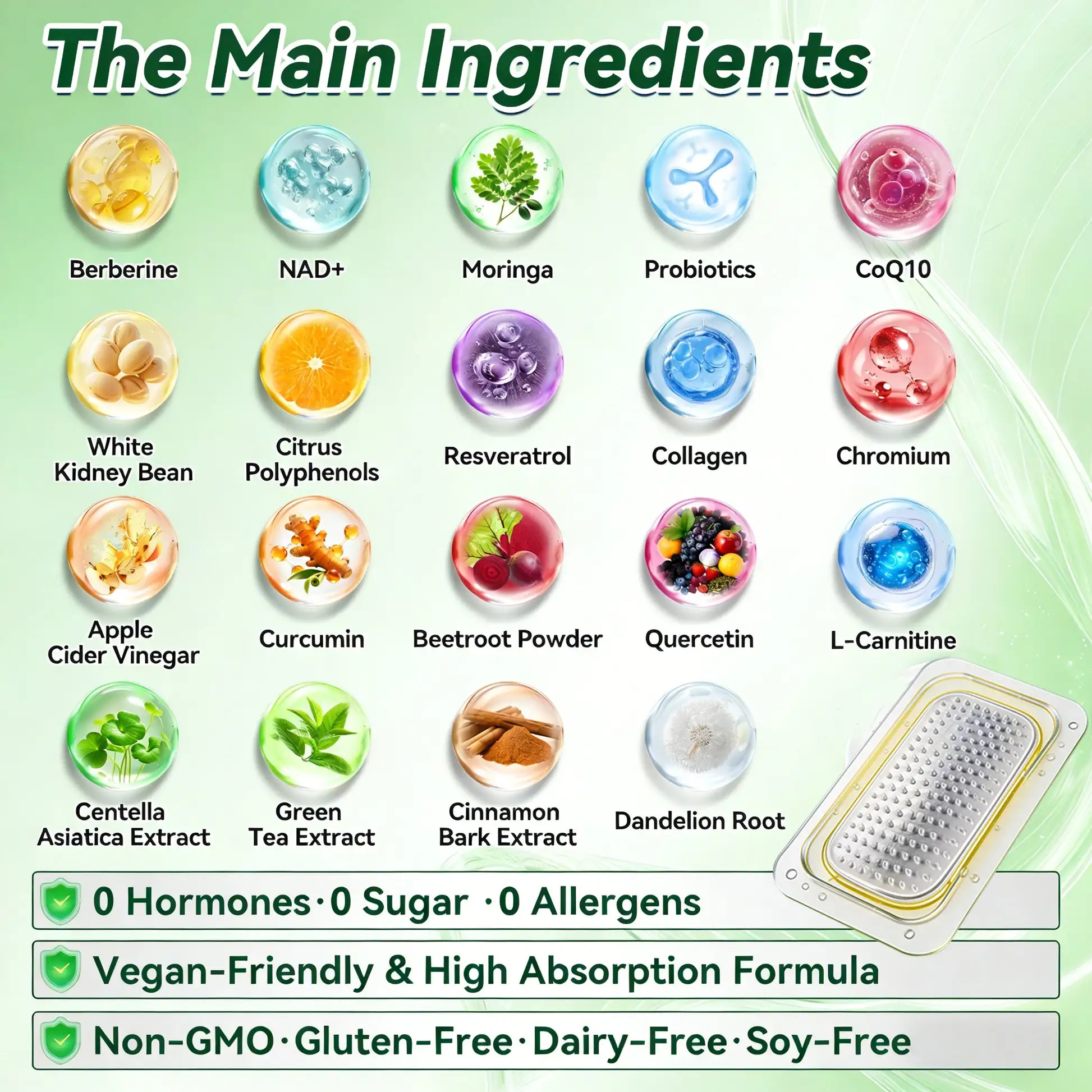 โ Easy Absorption: This formula uses an advanced nano microneedle patch delivery system. Combined with highly active ingredients such as berberine, it delivers key nutrients transdermally into the body, bypassing the digestive system and reducing gastrointestinal burden. The patch provides gentle, steady release for a more comfortable experience, making it especially suitable for individuals with sensitive digestion and those who prefer to avoid injectable weight-loss methods.